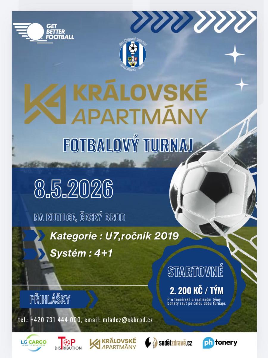 Májové turnaje pod záštitou Města Český Brod a hlavních partnerů Top Distribution a Královské Apartmány nabídnou letos velmi atrativní fotbalové zápasy. V pátek 1. května budou na hřišti bojovat týmy přípravky a turnaj je již plně obsazen. Následující pátek 8.května nastoupí ročník 2019 - U7 a zde máme ještě volná místa. Rádi přivítáme váš tým. Přihlášky a dotazy rád zodpoví Milan Jůza, mladez@skbrod.cz