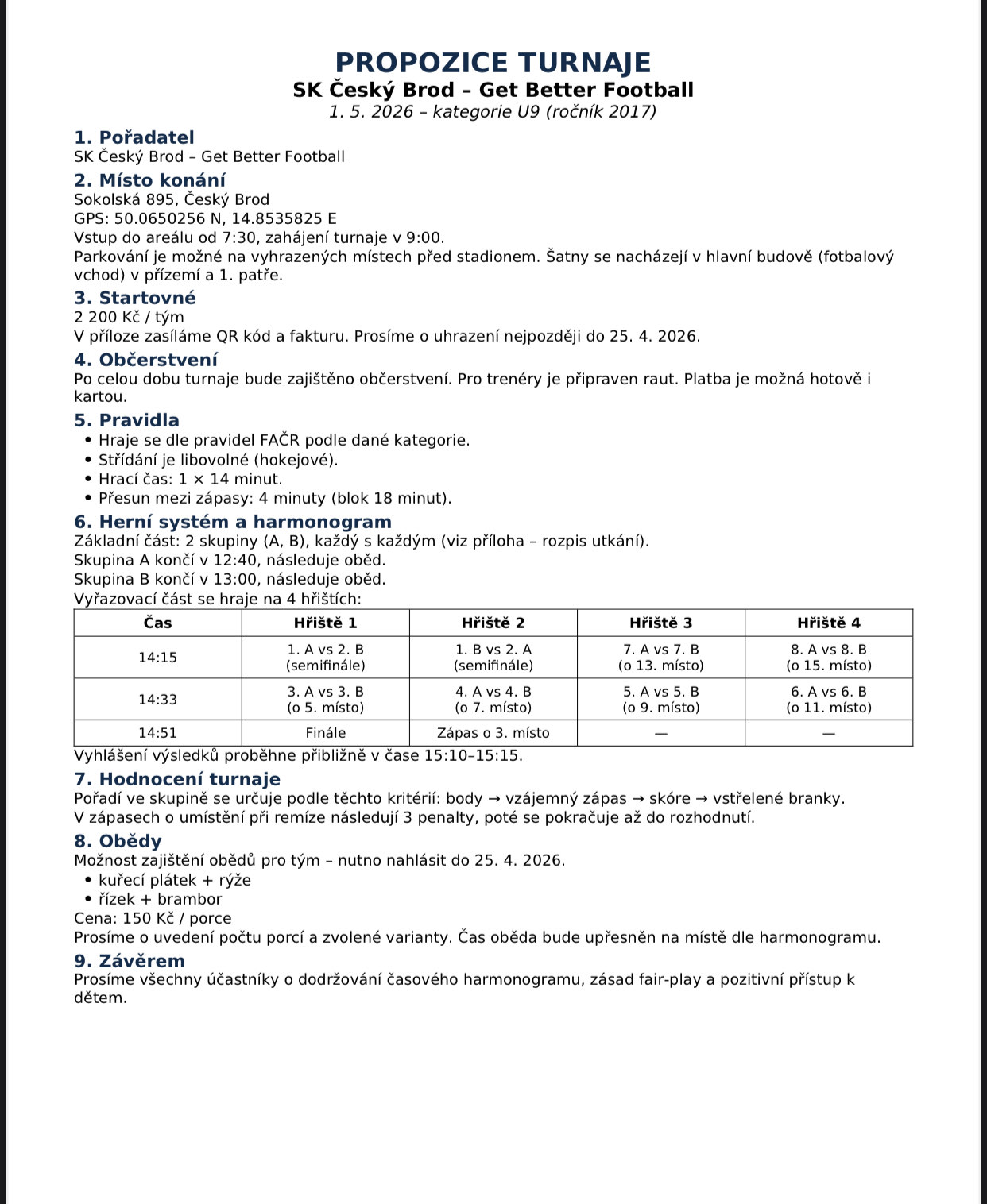Časový harmonogram: otevření areálu 7:30, začátek turnaje 9:00, předpokládaný konec turnaje cca 15:15